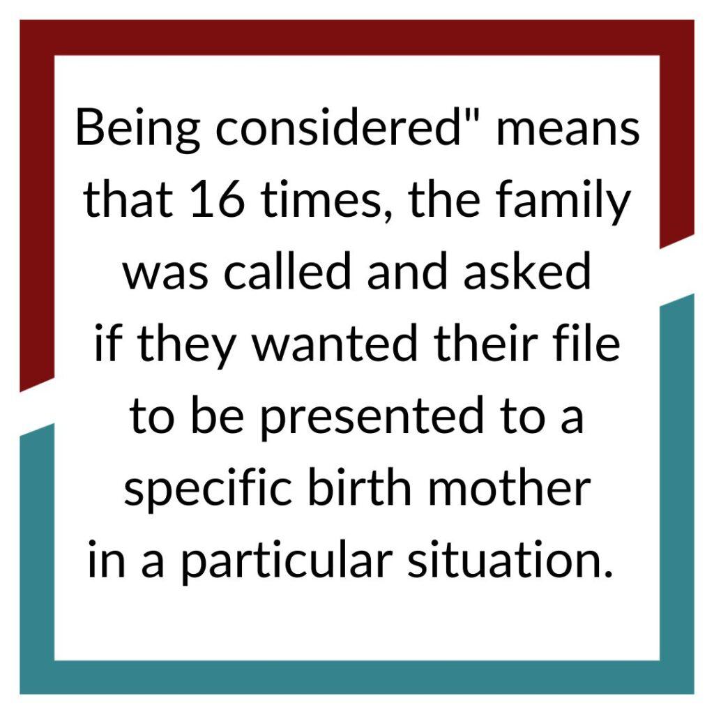 We knew the routine. We knew that we would be one of several families that a birth mother got to consider based on her personal preferences for her child. We knew that the birth mother, not the agency, chose the family for her child, and we knew that we might not get chosen right away because this wasn’t our first adoption, but we remained hopeful.