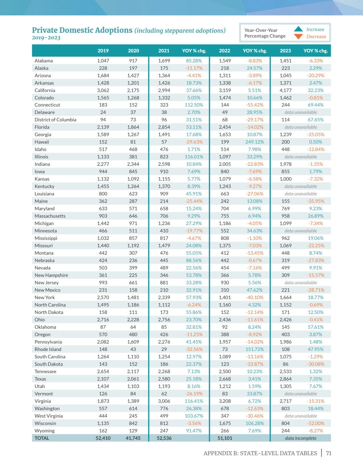 This decreased 1.52% from the previous year.19 In 2022, adoptions from foster care made up 66.48% of total adoptions, while private domestic non-stepparent adoptions made up 31.64%, and intercountry adoptions made up 1.88%. The total number of adoptions, including step-parent adoptions, was 106,196.” -NCFA: Adoption by the Numbers